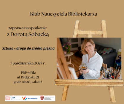 Serdecznie zapraszamy na spotkanie autorskie z malarką Panią Dorotą Sobacką "Sztuka - droga do źródła piękna", w ramach Klubu Nauczyciela Bibliotekarza. Obrazy pełne tajemnic, eteryczne, mgielne, grające światłem i kolorami - zapraszają nas do świata wyobraźni. Gwarantujemy niezapomniane wrażenia i moc inspiracji! Pani Dorota opowie …