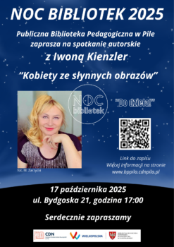Z okazji Nocy Bibliotek serdecznie zapraszamy wszystkich zainteresowanych na spotkanie autorskie z Iwoną Kienzler, które odbędzie się 17 października br. o godzinie 17:00 w Publicznej Bibliotece Pedagogicznej w Pile. Motywem przewodnim będą