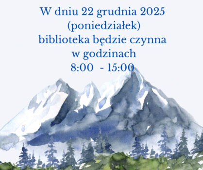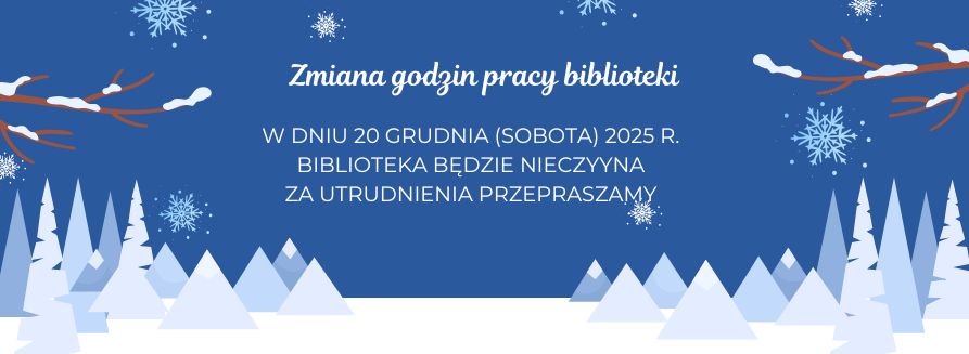 W okresie świątecznym29.12.2025 - 05.01.2026Biblioteka będzie czynnaw godzinach 8:00 - 15:00. 27.12.2025 i 03.01.2026 (soboty)Biblioteka będzie nieczynna.
