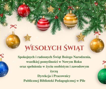 Spokojnych i radosnych Świąt Bożego Narodzenia, wszelkiej pomyślności w Nowym Roku oraz spełnienia w życiu osobistym i zawodowym życzą Dyrekcja i Pracownicy Publicznej Biblioteki Pedagogicznej w Pile