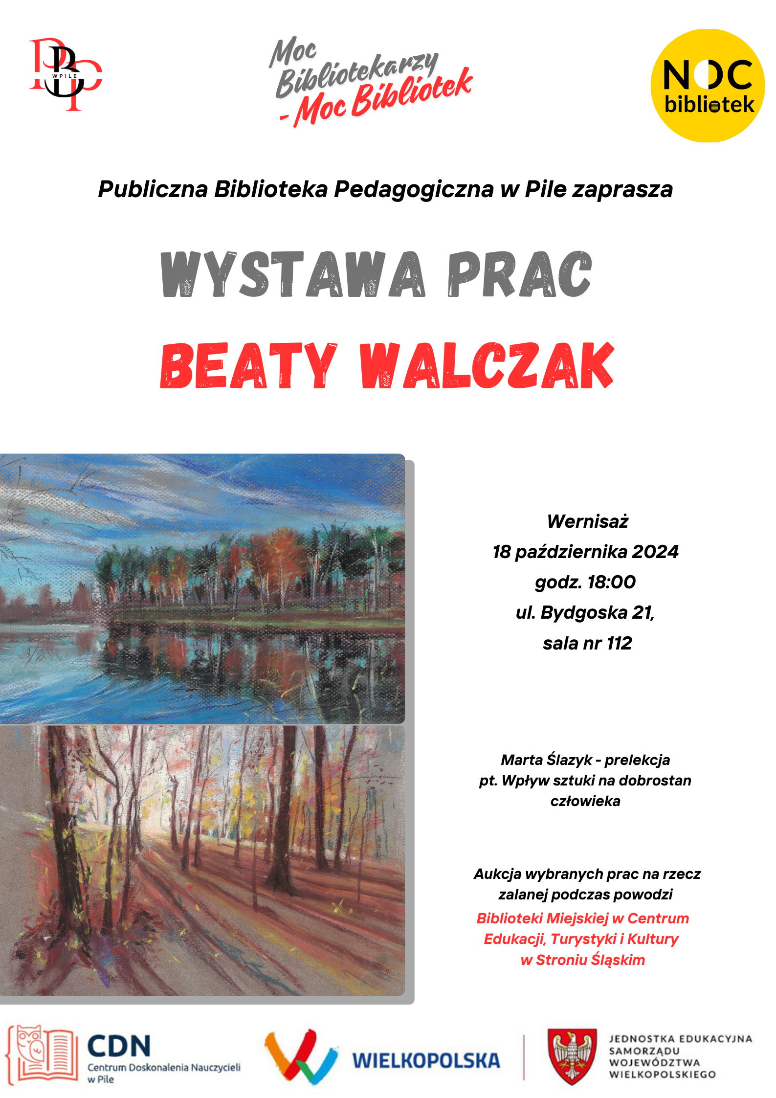 Publiczna Biblioteka Pedagogiczna ul. Bydgoska 21, Piła, wielkopolskie, PolandZapraszamy Państwa na IV edycję Nocy Bibliotek, która w tym roku odbędzie się pod hasłem Moc Bibliotek. Wydarzenie będzie miało miejsce 18.10.2024 r. o godz. 18:00 w Centrum Doskonalenia Nauczycieli przy ul. Bydgoskiej 21. Gościem głównym wieczoru będzie Beata Walczak, bibliotekarka, która swoje zamiłowanie do malarstwa odkryła stosunkowo niedawno, jednak zdążyła stworzyć już ponad sto […]
